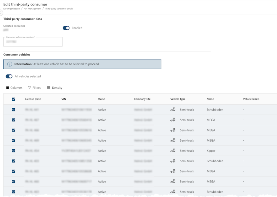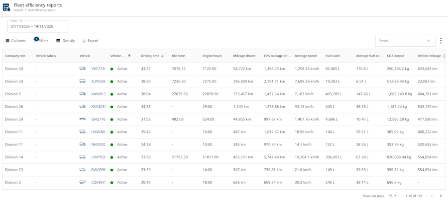 The fleet report displays the mileage of the vehicles as of the last time within the selected time interval. For vehicles with FMS, the displayed mileage is derived from the FMS data. For GPS-equipped vehicles, it is based on GPS data. Mileage is recorded from the present moment and is not retrospective.